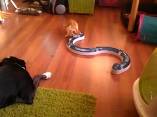 Koos is voor de duvel nog niet bang en heeft er echt al een sport van gemaakt om Shib zo vaak mogelijk te slaan en dan zo snel mogelijk weer weg te rennen en Shib kijkt af en toe een keer op met een blik van "het zal wel"
