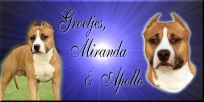 Ik ben Miranda,36 jr en woon in het zuiden van Nederland,ik ben sinds 8.5 jaar in het bezit van een Am.staff,zijn naam is Renegade's Royal Apollo...............gewoon Apollo dus :wink: